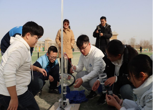 在后续活动中,实践团队突破原有教学模式,为同学们开展了一场“游园会”。针对高中生学习特点,采用“历史角色扮演+金融理论讲解”模式、生动有趣的物理实验等形式开展实践。水火箭、空气炮、角动量守恒等实验,极大提高同学们对物理知识的兴趣。同时,成员燕道华现场讲解实验原理,生动易懂的语言引得同学们掌声不断。